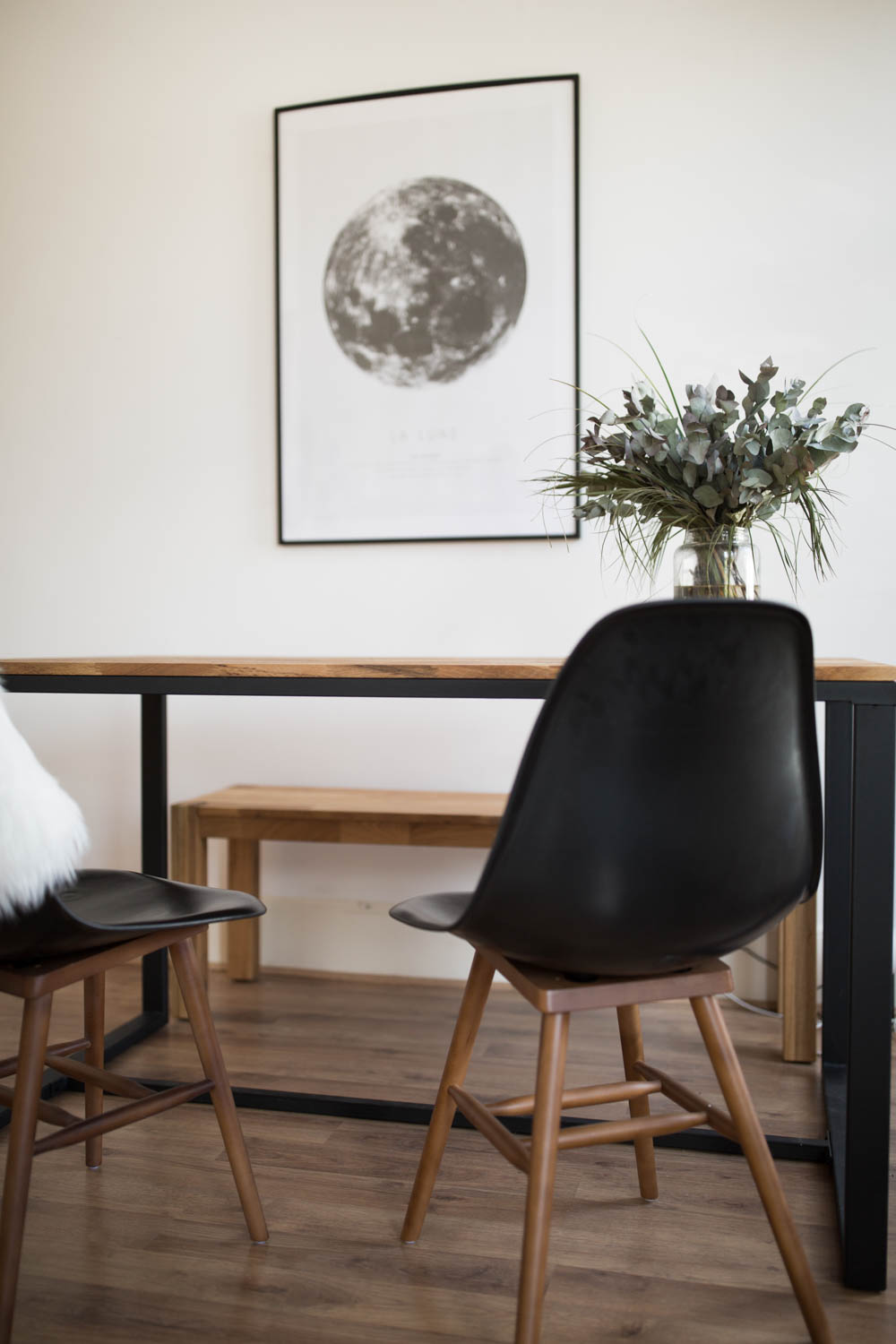 I think my favourite pieces are in the dining room set up. The table is such a gorgeous mix of wood, and I love the industrial/minimal iron table legs. I have always wanted a bench, over chairs at my dining room table, so this time, I went for two dining room chairs (Scandi inspired by Eames, of course) and a bench around the other side and I absolutely love sitting up there! I’ve never had a dining table before, so this is a relatively big step for my adulthood, and it means I can have friends round for dinner as often as I want to cook (or order us a takeaway).