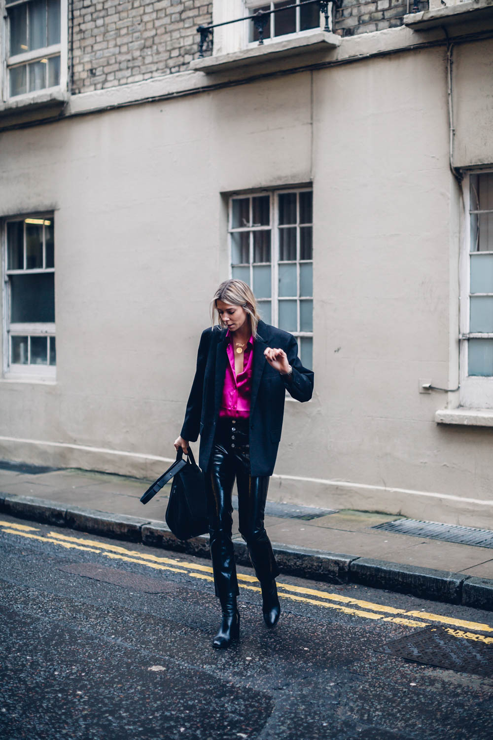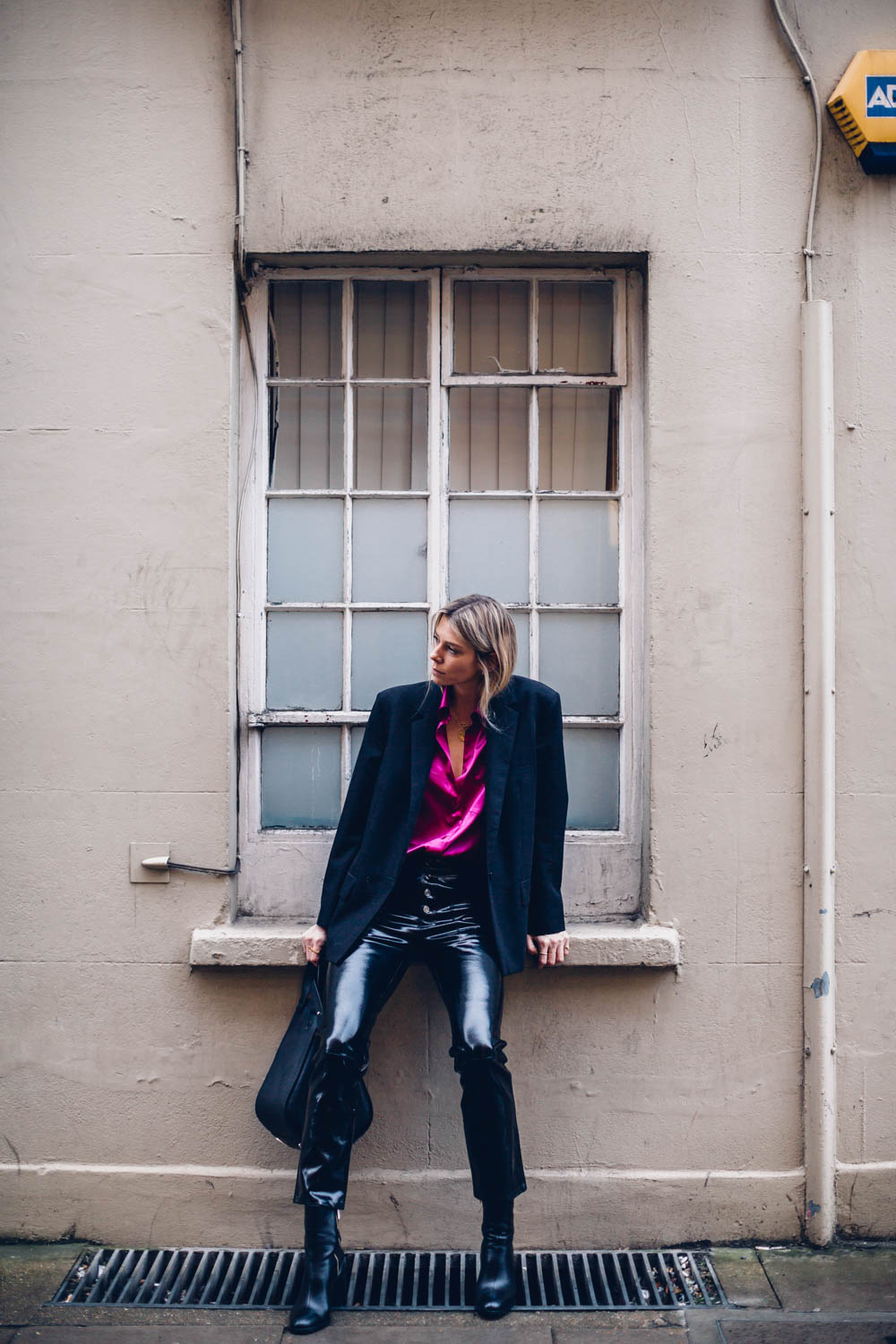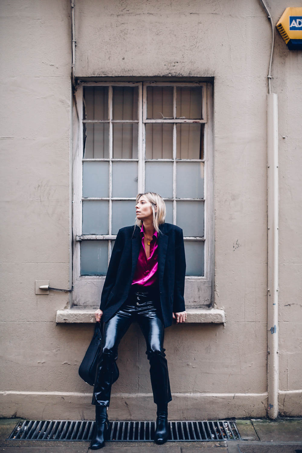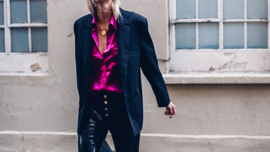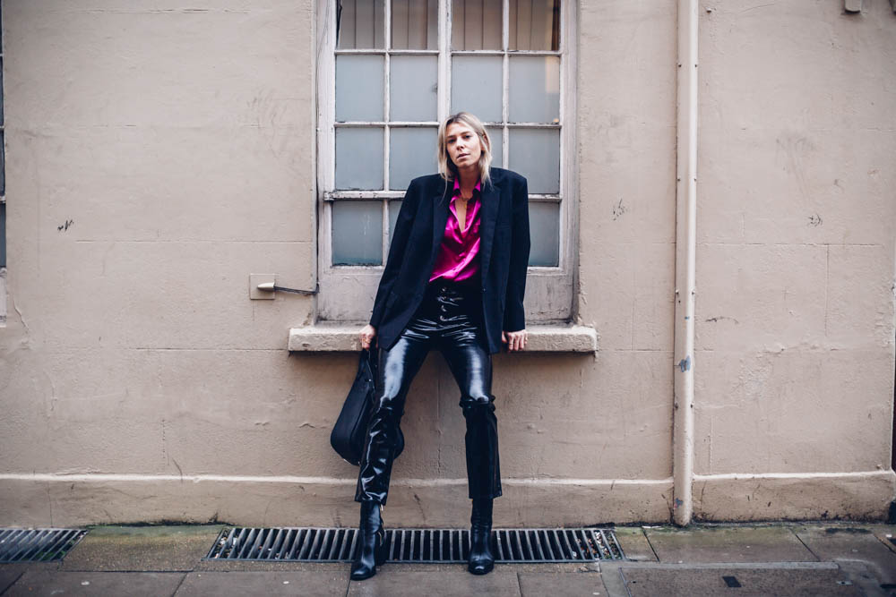 I am, however wearing all black to combat the extreme colour. So, swings and roundabouts. I’m wearing a boxy blazer and my trusty patent leather trousers here to make quite a special evening look. I am so happy I took the leap. The shirt also looks amazing with denim and converse too, which tones it right down if you’re a bit shy on the colour front.