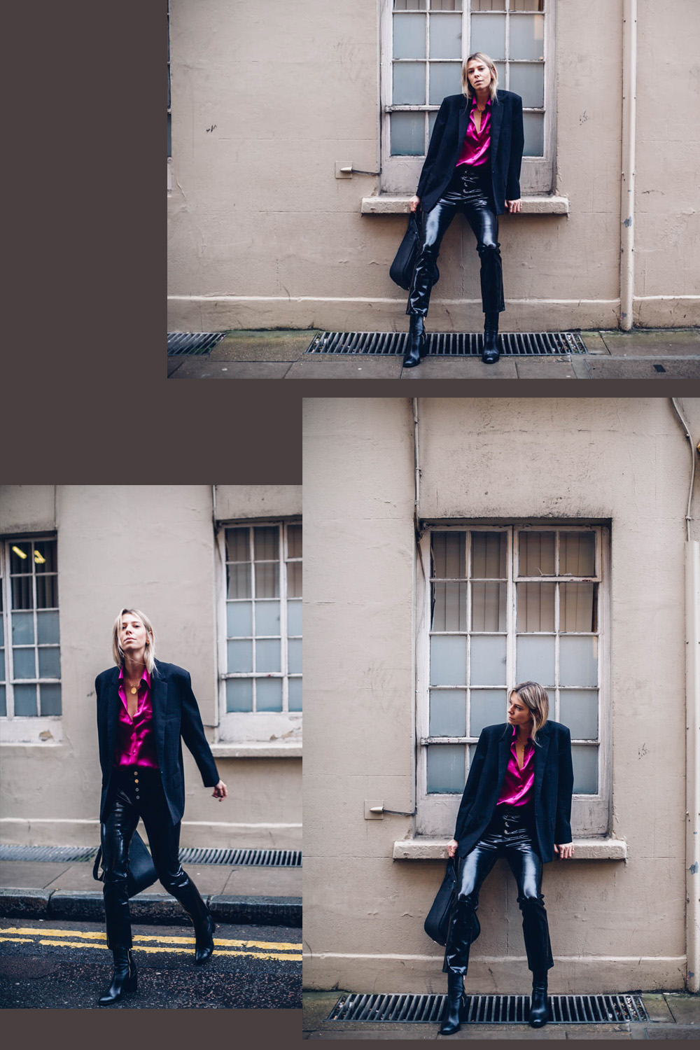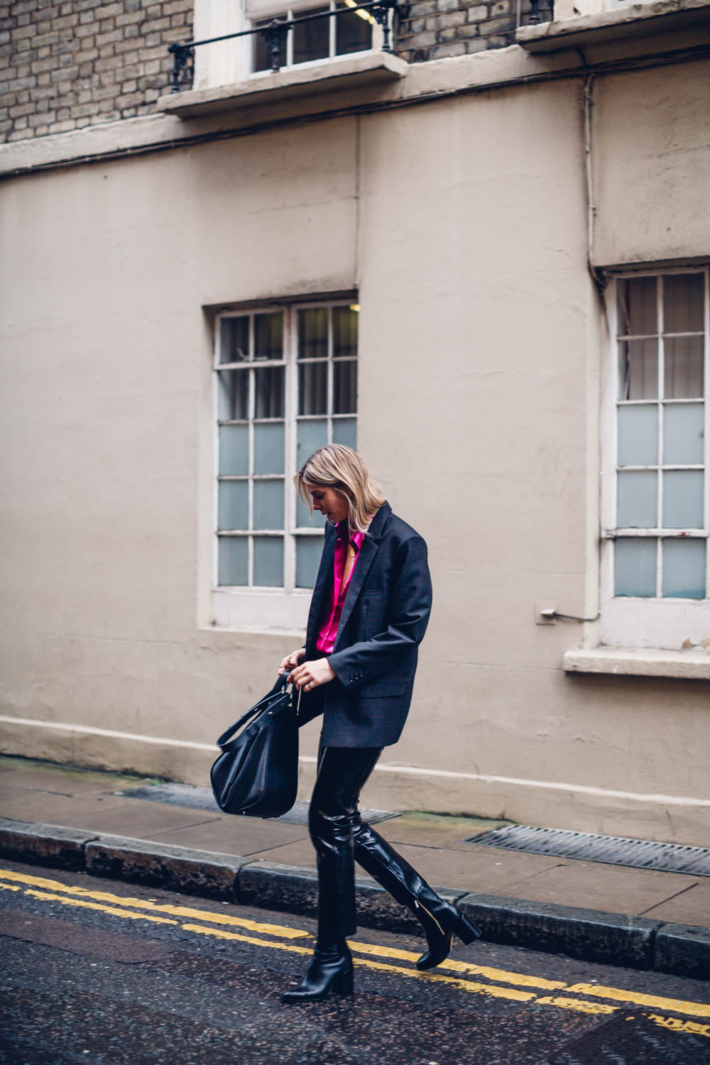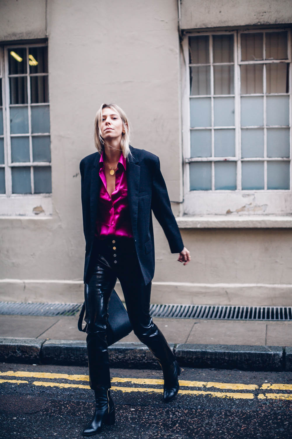 I am, however wearing all black to combat the extreme colour. So, swings and roundabouts. I’m wearing a boxy blazer and my trusty patent leather trousers here to make quite a special evening look. I am so happy I took the leap. The shirt also looks amazing with denim and converse too, which tones it right down if you’re a bit shy on the colour front.