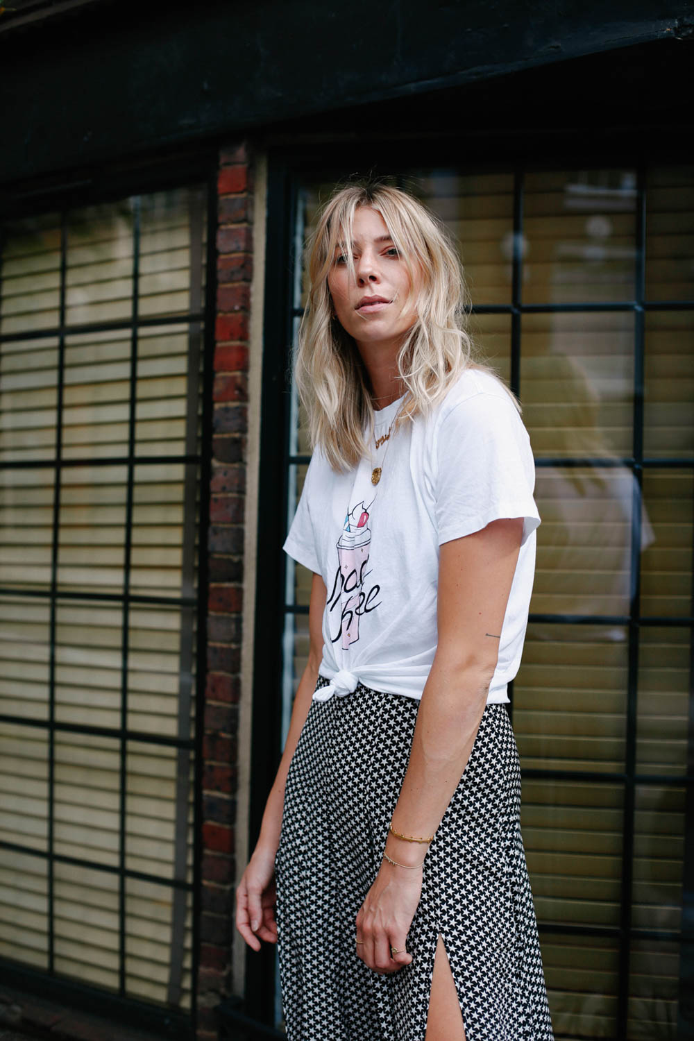 This skirt is amazing. The quality is incredible and it fits me like a dream. I love the super long slits that give the skirt so much movement, because I always think a midi skirt has the capacity to make you look frumpy! The star print is 100% me, and I adore it. I popped on my Ganni tee for a bit more of a relaxed contrast and Aquazzura heels to give the skirt some height (because I don’r need any really…)