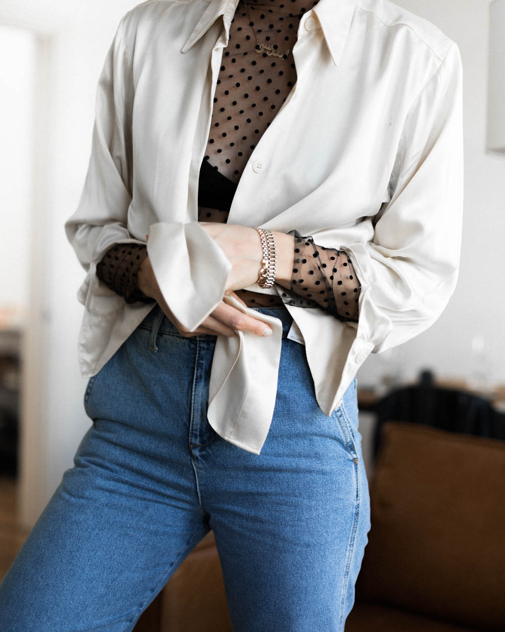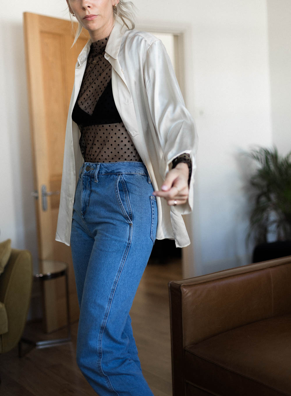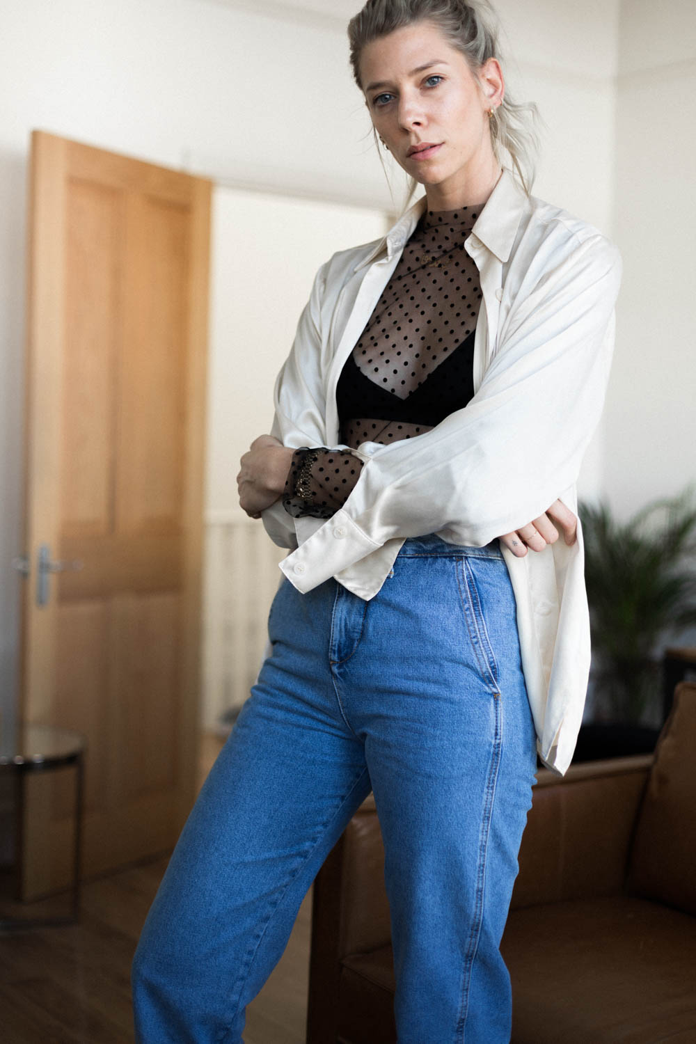 You know me, forever dressed down, and this look is no different. Versatility is key when choosing an outfit that’s going to make your part with your hard earned cash. I’ve had this silk shirt for a couple of months now, and it’s literally worn at least once per week- it comes in light blue too, and that’s next on my hit list. Whether you’re dressing for work or heading out with friends at the weekend, this shirt has got you covered. I’ve used it as a layer for this look to bring a little bit of a relaxed feel to it. Underneath I’ve got this incredible sheer polka dot layer from the Boutique range, which as you already know, has my heart! Whether you’ve got boobs or not, I think this can work as long as you’re wearing the right bra underneath. I can only vouch for smaller boobs at this point, for obvious reasons, but I always go for a soft triangle bra either with or without lace.
