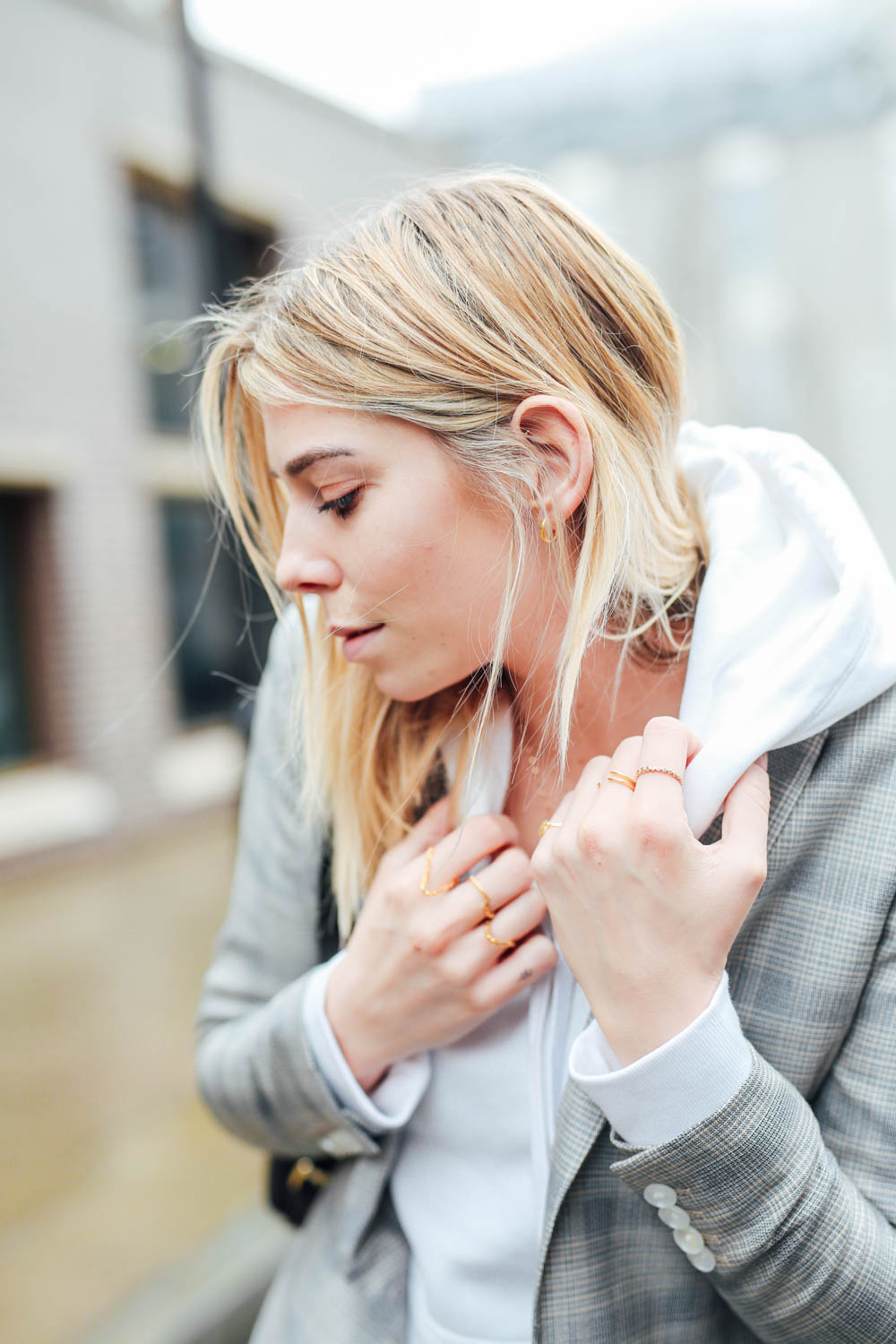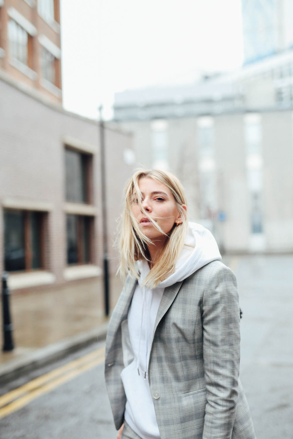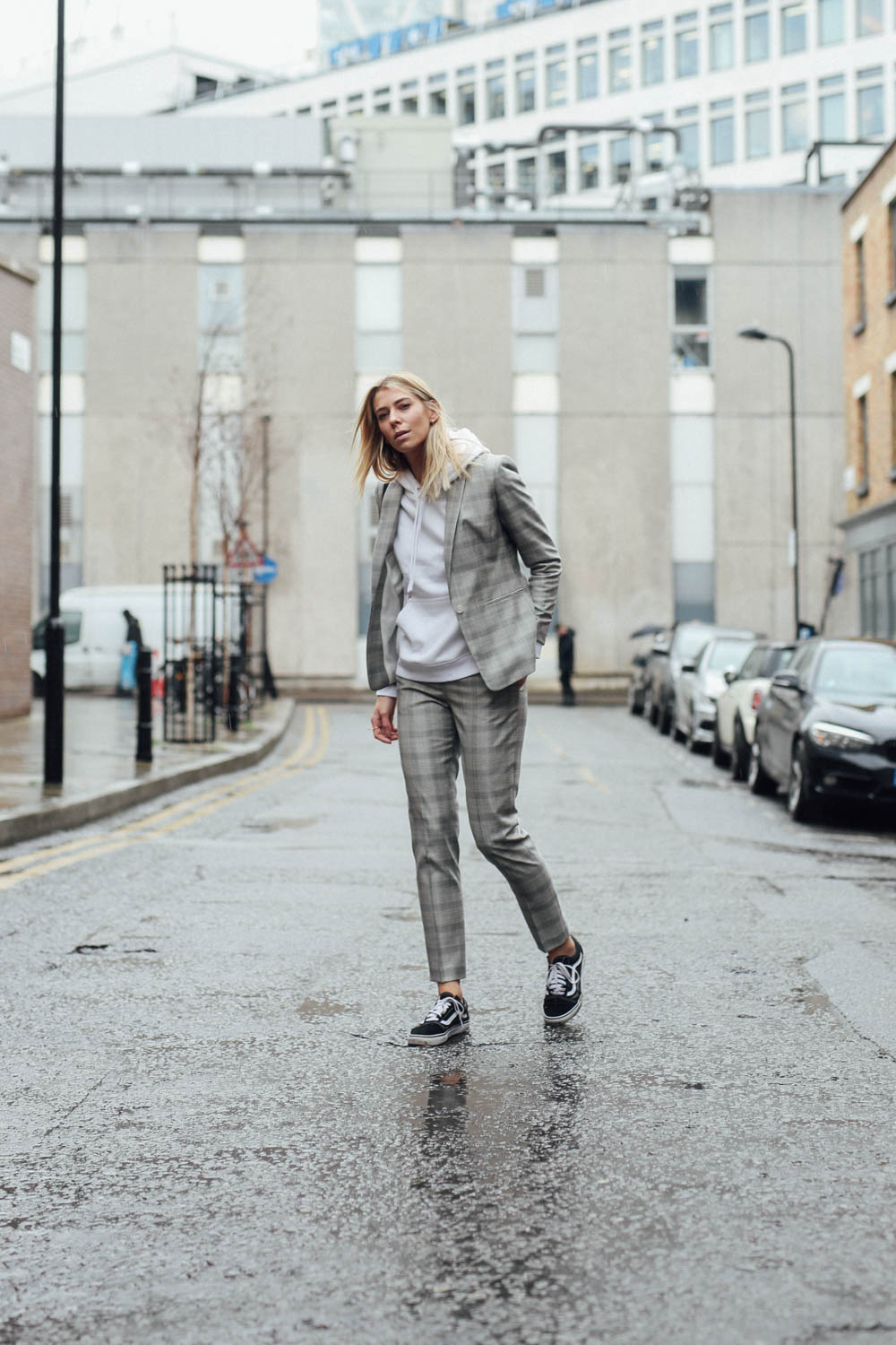 The second look was shockingly, another suit. This time I chose a checked pattern in tones of grey with a subtle hint of yellow. The only thing I wanted to pair this look with was a hoody. I’m borderline obsessed with the hoody under a smart jacket look so this was a no-brainier.