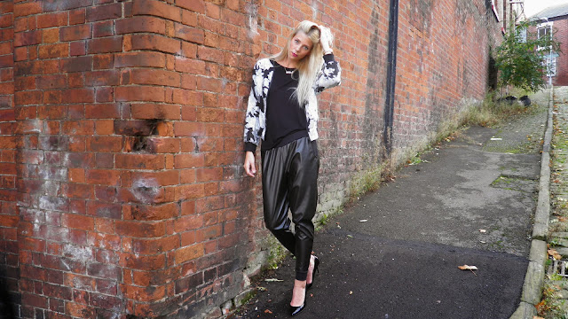 I teamed my bomber with a basic long sleeved tee from TK Maxx, leather trackies from Missguided & patent heels from Dune.