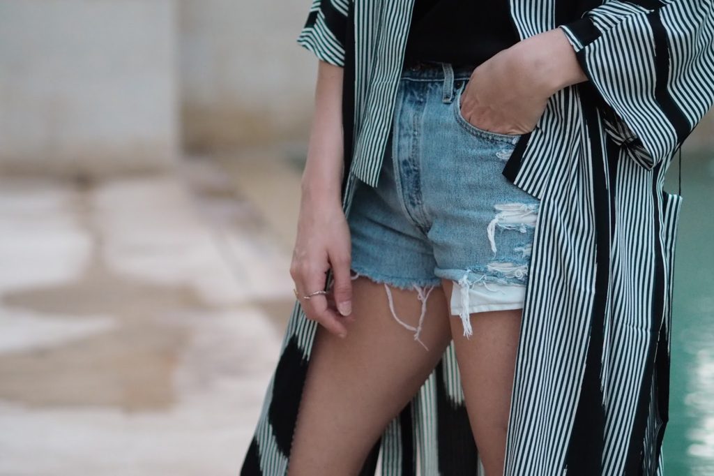 This cool monochrome kimono is by Weekday, who are one of my favourite, affordable Danish brands. As minimal as it this piece is, it’s still oversized and needs something basic paired with it. I chose my trusty Levi’s cut offs and, another piece from Weekday which is two seasons old, this silky black cami which goes with everything.