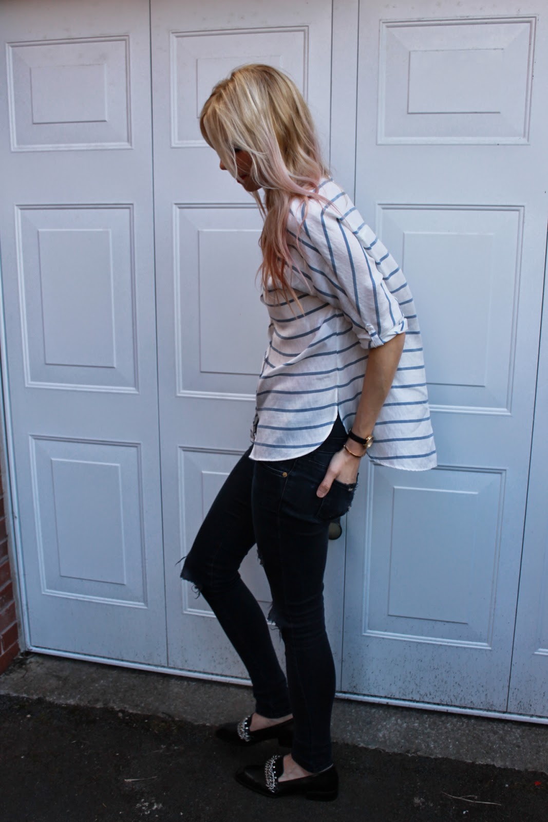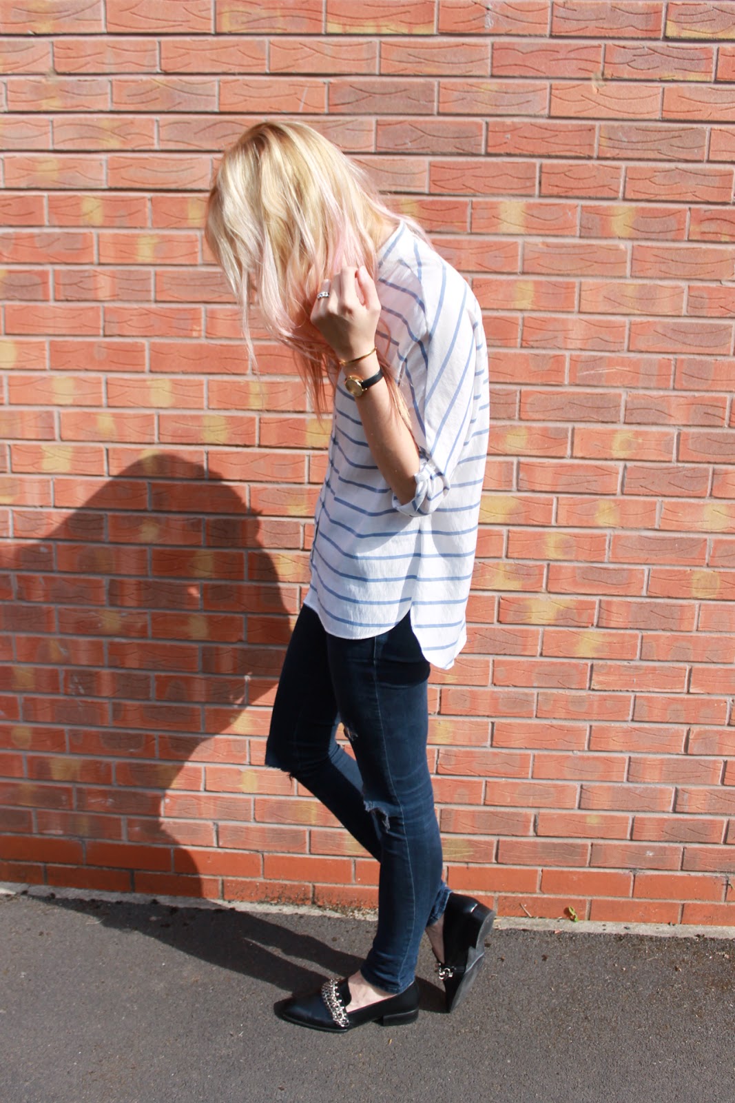 There are two things that hold a strong place in my wardrobe, stripes and ripped jeans, not to mention these killer chained slip ons I got in the Zara sale – I saw those babies ages ago and couldn’t believe that they went down to £25.99. I am dying over them! My shirt is new season Zara, the first of many Zara purchases for the season ahead. I really think that stripes are wearable season after season so I *try* to tell myself that striped pieces are investments, and it helps me sleep at night. I’m wearing my beloved Olivia Burton midi dial watch and Monica Vinader Fiji bracelet in these shots – I am such a magpie when it comes to jewels! My hair is freshly coloured rose gold and I really love it! Such a nice change.