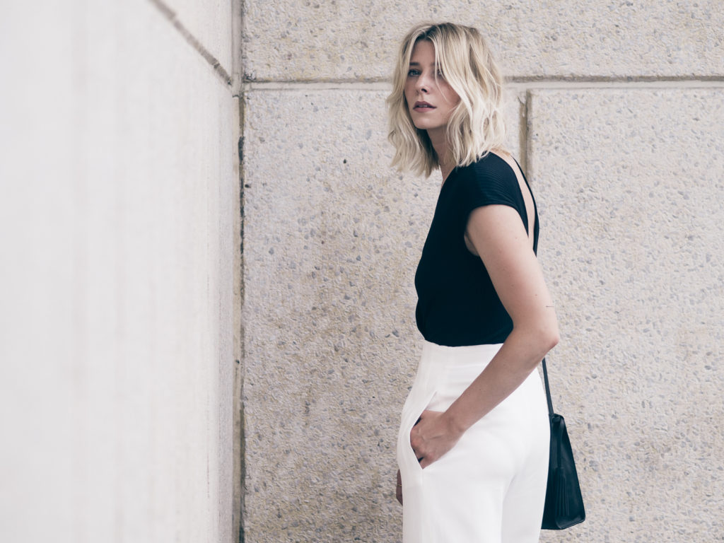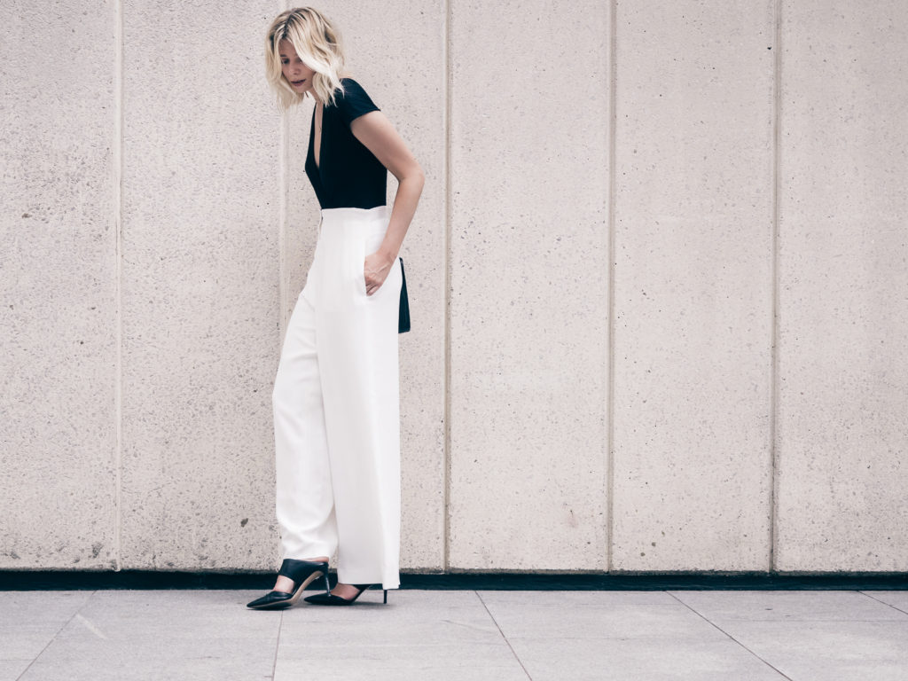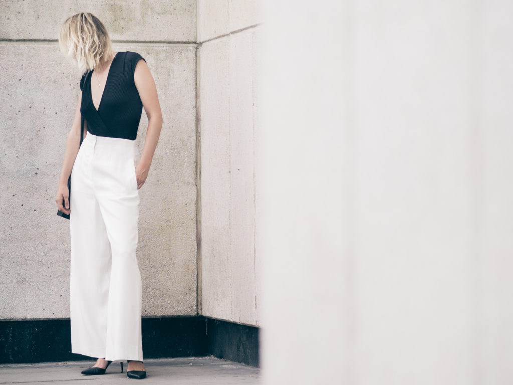 The colour of the trousers makes the outfit a little more polished which means you can keep your top fairly basic – your trousers are doing the talking. I popped on a ribbed plunge neck body suit for a clean look.