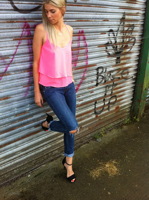 I can’t get enough of little cami’s at the moment. ARK Clothing have got the most perfect one online, beautifully shaped and lovely and bright for the last of our Summer. I’m not traditionally a girls girl so when I chose the pink one, my instinct was to tone it right down with some ripped, slim leg denim & add some staple black heels to add a touch of chic.